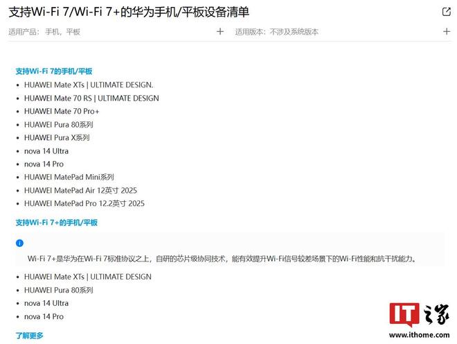 IT之家注意到,华为官网现更新了支持自己 Wi-Fi 7 / Wi-Fi 7+ 的华为手机 / 平板设备清单,其中解释了 Wi-Fi 7+ 技术的定义:Wi-Fi 7+ 是华为在 Wi-Fi 7 标准协议之上,自研的芯片级协同技术,能有效提升 Wi-Fi 信号较差场景下的 Wi-Fi 性能和抗干扰能力。具体清单如下: