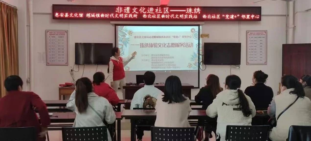 在螺城镇西北社区,文化特派员陈凤组织开展珠绣非遗体验活动。丝线穿梭、银针起落,约30位居民在指尖流转中感受传统手艺的温度。“参与者以中老年人为主,大家眼神专注,手法虽不熟练却满怀热情。”她表示,通过持续培育,一个可持续运营的“社区非遗角”正逐步成形,成为邻里互动、代际交流的文化空间,同时希望更多年轻人能走近非遗、爱上非遗。