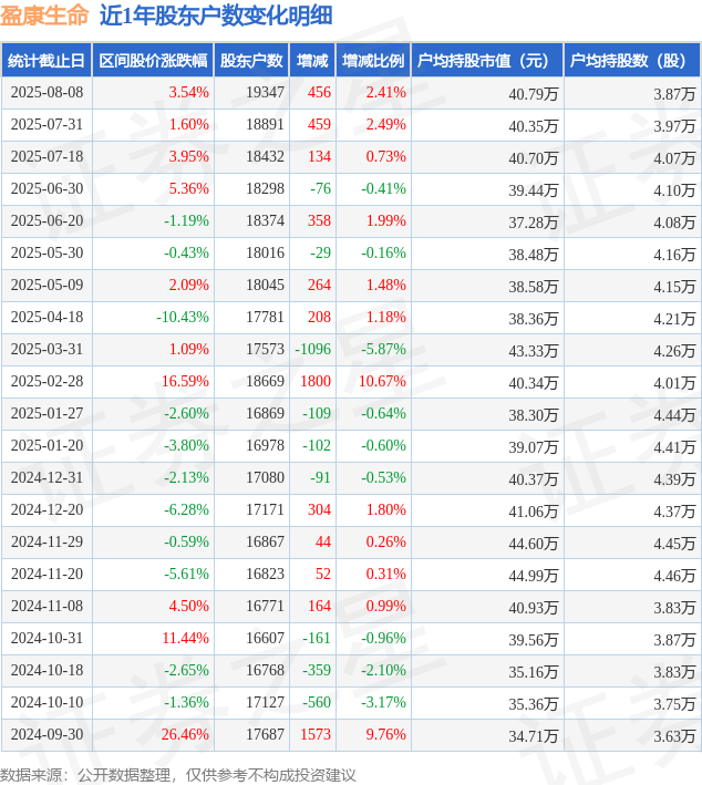 从股价来看,2025年7月31日至2025年8月8日,盈康生命区间涨幅为3.54%,在此期间股东户数增加456.0户,增幅为2.41%。