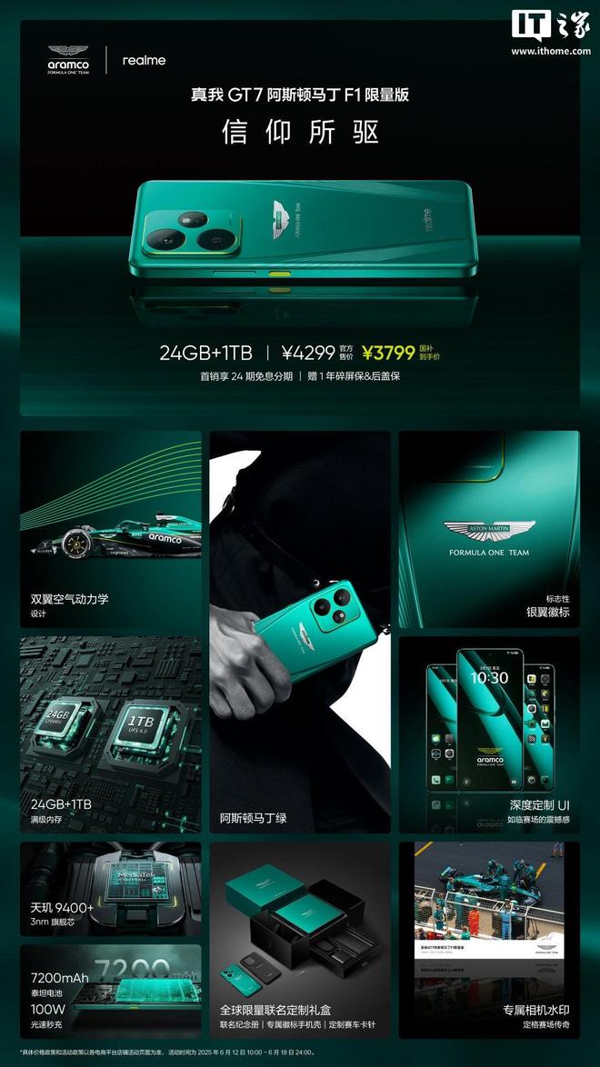 据IT之家此前报道,今年 6 月 12 日,真我 GT7 阿斯顿马丁 F1 限量版正式开售,售价 4299 元,国补到手价 3799 元。该机亮点如下: